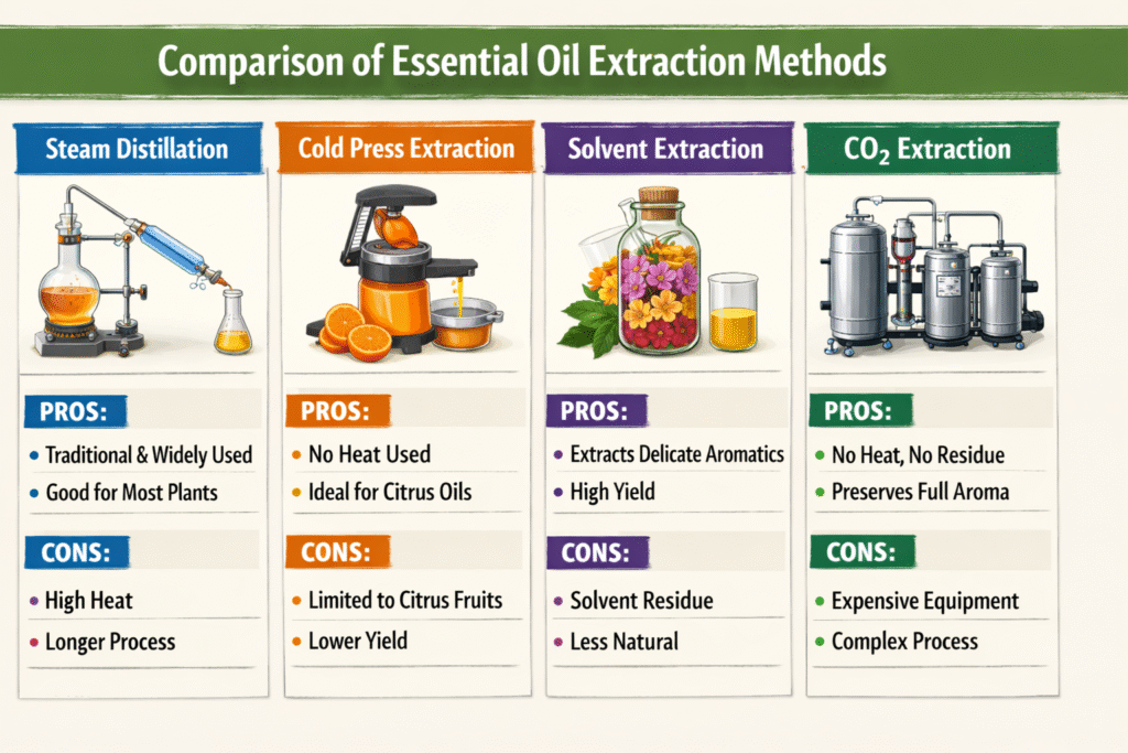 Unlike carrier oils or herbal infusions, essential oils are not fatty oils. They evaporate quickly, are highly concentrated, and can interact with the human body at very low doses. Producing these oils requires methods that separate volatile compounds from plant material while preserving chemical integrity [2].