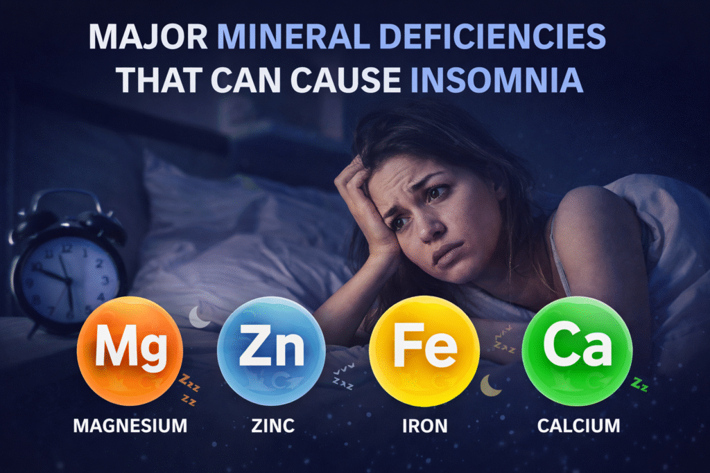 Mineral Deficiencies That Cause Insomnia: Sleep is one of the most vital functions of the human body, essential for physical restoration, mental clarity, and emotional balance. Yet, millions struggle with insomnia the persistent difficulty of falling asleep or staying asleep. While stress, lifestyle, and screen time are often blamed, a less obvious factor is nutrient deficiency, particularly mineral shortages. In 2026, research increasingly shows that minerals such as magnesium, iron, zinc, calcium, potassium, and copper play a key role in sleep regulation [1][2][3].