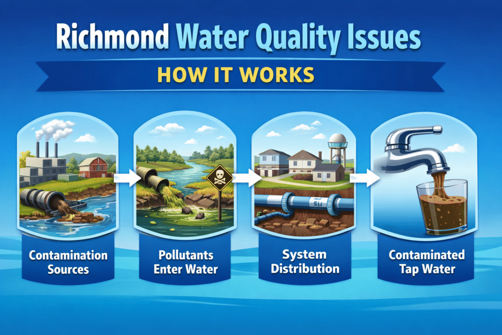 The mechanics of water contamination and treatment are rooted in complex environmental chemistry and fluid dynamics. To understand how Richmond water quality issues develop, it is necessary to trace the path of water from its environmental source to the consumer tap. Source water is continuously subjected to environmental inputs. Rainwater washes pesticides and fertilizers from agricultural lands into rivers, while industrial facilities may discharge trace amounts of synthetic chemicals into the ecosystem [5].