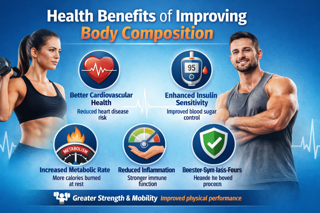 Improved body composition is associated with better insulin sensitivity, reduced inflammation, improved lipid profiles, and lower risk of cardiovascular disease [9]. Increased muscle mass also enhances glucose uptake and metabolic efficiency.